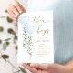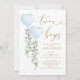 This elegant baby shower invitation features soft sage green eucalyptus, two watercolor blue balloons and modern lettering.