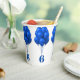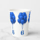 Blue balloons paper cups for a child's birthday. Include his, or her, age which will wrap around the cup. Each number appears to be holding a bunch of bright blue balloons.