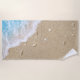 Beautiful blue beach waves rolling up on soft beach sand covered in pretty seashells decorate this beach towel.
