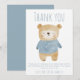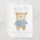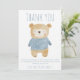 Express votre gratitude avec cet adorable carte de remerciements de baby shower avec une illustration d'ours doux portant un pull bleu doux. Le design minimaliste et pastel est parfait pour les bébés garçons et comporte un message chaleureux avec le texte du nom de famille. Idéal pour remercier vos invités pour leurs cadeaux réfléchis et leurs bons voeux.