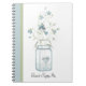 Elegant notebook done in a cottage chic style, with a vintage illustration of delicate blue bells in a mason jar. A light blue and green band decorates the left side, of the notebook. The couple's initials are on the mason jar and additional text, at the bottom, is ready to personalize for your big day. Great guest sign in book for your wedding ceremony and reception.