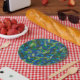 Paper plates featuring elegant floral pattern, blueberries and green leaves. Textured design elaborated from handmade tissue paper collage. Colour Palette: Classic Chambray Chathams Cerulean Blue, Olive Sycamore Chartreuse Asparagus Green, © Clipso-Callipso / Julia Khoroshikh, 2019 www.clipsocallipso.art #papercollage #classicblue #pantone2020 #blueandgreen #blueberries #floralpattern #florals #clipsocallipso #plates #paperplates #partysupplies