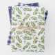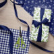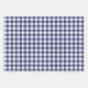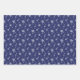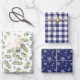 Pretty blue and white holiday wrapping paper sheets featuring three matching patterns: greenery twigs with white flowers and blue berries, blue gingham, and white snowflakes against dark blue.