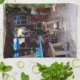 Casual, relaxed, riding around on bicycles, these are some of the things that make up the comfortable lifestyle pictured in this original photograph of an aqua blue bicycle leaning against a post in front of an open air bar in Key West, Florida. There is a leafy green bush in a tub, under an awning which matches the colour of the bike. The dark interior of the place is filled with wooden bar stools, and aqua and cobalt blue umbrellas over the tables. An aqua blue bar in front completes the colourful photo.