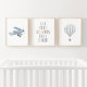 Add a finishing touch to your little one's travel themed space with this set of three watercolor biplane, hot air balloon, and quote prints.
