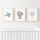 Add a finishing touch to your little one's travel themed space with this set of three watercolor biplane, hot air balloon, and globe prints.