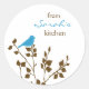 Cute personalized kitchen baking and canning stickers with a whimsical aqua blue and brown bird design.