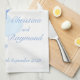 Cute love bird couple in graphic drawing of open bird cage hanging from a blossoming spring tree with hearts. Fashionable modern chic wedding design part of the bird cage romantic wedding stationary set. Edit this commemorative wedding kitchen towel with your bride and grooms names and special wedding date. Perfect for a wonderful unique keepsake gift to the happy couple or just to commemorate your special day. Unique drawing and design by Sarah Trett. www.mylittleedenweddings.com