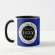 Blue, Black and White, Class Reunion Mugs. Nice, Class reunion gift ideas for ANY YEAR and CHANGE COLORS. Class reunion mugs come in a variety of Accent Colours, White Ceramic Mugs, 11 oz or 15 oz, Latte, Travel Mugs and more. See brief instructions Below to Fully Customize these coffee mugs or, BEFORE you Order, CALL Designer Linda: 239-949-9090 EST 10am to 6pm Monday to Friday or as available. I can CHANGE the COLORS, Designs, Text or HELP you to make many changes. Only I, Designer Linda can Change the Black and White Circle and centre round designs. You can change the Blue background and Black and White Text, change the Text Style, Size, Colours, etc.