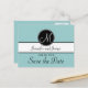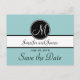 Elegant, Simple, Blue, Black and White Monogram Modern Save the Date Postcards. Elke Clarke © These wedding announcement postcards are shown with a light blue background, white monogram initial on a black circle tag and bride and groom names on a black and white stripe. Customize with bride and groom names and your wedding announcement text, monogram initial, and wedding date using Zazzle's easy to use menu prompts. This simple yet elegant monogram initial design works for all letters of the alphabet and is fully customizable. For other colour combinations please contact luxuryweddinginvitations@gmail.com