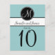 Elegant Simple Blue Black White Monogram Wedding Table Number Cards. Elke Clarke © These wedding Table Number postcards are shown with a light blue background, white monogram initial on a black circle tag and bride and groom names on a black and white stripe. Customize with bride and groom names, monogram initial, table number and wedding colours using Zazzle's easy to use menu prompts. This simple yet elegant monogram initial design works for all letters of the alphabet and is fully customizable to suit any colour combination. Order one card for each different table number. You change it to each number and then add to your cart.