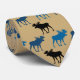 Moose silhouette images in black, dark blue and medium blue march across this unique men's necktie. The images are placed on a light gold background.