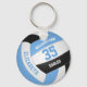 This sporty volleyball themed keychain features a realistic looking light blue, black and white volleyball upon which you can customize the player's name & jersey number plus school or club name and mascot name in a varsity letter style font - by katz_d_zynes | search ALL katzdzynes' blue & grey or blue & black volleyball team colours gifts >>>> https://www.zazzle.com/store/katz_d_zynes/products?cg=196655886495428252