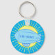Cute cartoon style blue blimp drawing. Bright yellow sun in the background. Custom keychains. Edit name on the balloon to customize it. Gift idea.