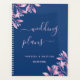 An elegant and trendy floral planner for your wedding. Personalize and add your names and date. The text: Wedding Plans is written with a large trendy hand lettered script with swashes. Pink text. Blue background decorated with pink botanical sprigs and foliage.