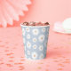 Add a finishing touch to your little one's birthday party with these paper cups, featuring a pattern of daisies on a light blue background.