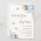 Modern butterfly kisses and baby wishes baby shower invitation featuring two bohemian style dry floral arrangements with pampas grass, blue roses and palm leaves. The design also features three faux rose gold glitter butterflies and a modern mono-line calligraphy font heading.