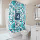 Custom monogrammed shower curtain with a whimsical vintage floral pattern in shades of blue and white. Personalize it with your monogram initial in a dark navy square frame. Use the design tools to edit the text fonts and colours and add your own photos to create a one of a kind design.
