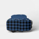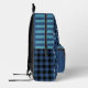 Blue backpack perfect for your dog's treats and toys and blankets with a blue and black pattern of bones and balls and paw prints with stripes and a blue buffalo check, personalized with your dog's name beneath a paw print. Blue paw print backpack personalized with name in a white script with a mix of patterns like stripes, blue buffalo check, and bones and balls and paw prints.