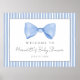This elegant horizontal sign features a soft blue watercolor bowtie-style bow at the top, framed by cute blue and white stripes around the edges. The grey fonts combine script and serif typography for a timeless and charming look. The design includes a delicate double-line border, which can be customized by changing the background or line colours to match your baby shower theme.