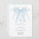Featuring a soft powder-blue ribbon bow adorned with delicate florals and pearls, plus a classic cross and airy script typography.