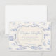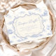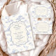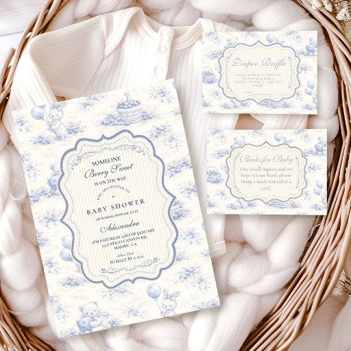 A sweet vintage-inspired design featuring delicate blue bows, soft striped detailing, and charming blueberry garden illustrations. Toile-style artwork with adorable animals and fruit baskets creates a classic storybook feel in a soft powder blue palette. The ornate central frame adds elegance while keeping the overall look light, refined, and timeless. Perfect for a baby shower with a gentle garden theme and a touch of traditional charm.