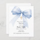 A white background, decorated with a light blue large bow and a golden cross. Personalize and add the name and details details.