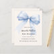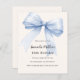 A soft beige, cream coloured background, decorated with a large light blue bow. Personalize and add a name and party details.