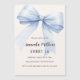 A soft beige, cream coloured background, decorated with a large light blue bow. Personalize and add a name and party details.