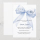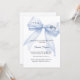 An elegant white background, decorated with a large blue bow with pearls. Personalize and add a name and party details.