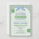 Invite your friends and family to shower the mom to be of a little lucky charm! With a blue bow at the top of an arch-shaped background, a lucky horseshoe in the word Lucky, and two four leaf clovers for extra good luck. The details are drawn digitally by hand. The background is a cottagecore cute gingham pattern in sage green.