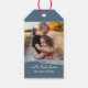 Beautiful smoky blue bow design photo gift tags with your own personal family photo and message. Edit with your own message and font styles.