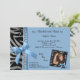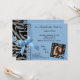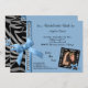 Blue ribbon and silver pearls with black and silver zebra stripes decorate this contemporary party invitation. Upload your own photo to the funky zebra frame to further personalize the look. There is plenty of customizable text on this trendy invitation to add your party information. We also have this design in various colours. Coordinating colours on the back of this plush invitation complete the look and makes this premium design perfect for almost any occasion.