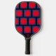This design has a fun patter made up of blue boxes and red circles, set on a black background. This paddle can be customized by changing the colours. These paddles are approved for use by USA Pickleball (formerly USAPA). You can choose your grip colour, black, white or tan. For an additional cost you can purchase a protective cover and an outdoor Pickleball Ball.