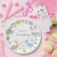 Cute dinosaur birthday paper plates featuring hand-drawn dinosaurs, balloons, and tropical leaves in soft pastel colours of green, blue, peach, and yellow. A fun, gender-neutral design perfect for a 2nd birthday or any dino-themed party. Modern, whimsical, and easy to personalize.