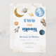 Deux la lune ! Vous planifiez une fête de deuxième anniversaire ? Rassemblez famille et amis avec une invitation personnalisée do-it-yourself bleu deux la lune deuxième anniversaire de fête. Modifiez facilement l'invitation de 2e anniversaire de votre garçon modifiable avec tous les détails de la fête d'anniversaire de l'espace. Ce modèle d'invitation à la fête d'anniversaire de la lune orange et bleu éditable donne le ton de votre fête d'anniversaire de l'espace extra-atmosphérique. La collection APOLLO comprend un arrière - plan blanc avec des planètes aquarelles, un astronaute et une fusée, ainsi qu'une lune d'or brillante et des étoiles. Une association de polices serif, sans serif et rétro avec tout le texte modifiable complète cet espace extra bleu, or et orange deux la lune 2ème invitation fête d'anniversaire.