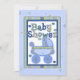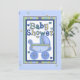 Blue for boys; Baby carriage, hearts, polka dots and stripes, baby showere invitations.