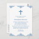 This classic, traditional boys baptism or christening invitation features a blue cross and a decorative blue design along the top and bottom edges of the invite. The text can be changed to suit a First Communion instead of a baptism or christening. Add your return address to the back, and any additional text if desired.