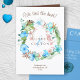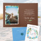 Bahama blue and green banana leaves with solid brown inside the card is a beautiful way to announce your tropical elopement! Boho flowers wreath is versatile for dusty blue, elegant light blue, and aqua wedding theme colours. Leafy wreath with sage green banana leaves, eucalyptus, and brown ferns is perfect for summer tropical wedding invitations. Easily add your elopement photo inside folded tropical wedding card.