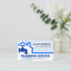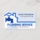 Cover features a blue home frame design with a leaking faucet. The leaking water highlights your business name and a slogan caption which you can change. At the top corner of the card you have your prestigious name and the job title.