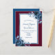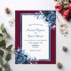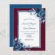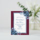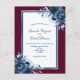 On front: A burgundy background with a simple faux silver, classic blue and white frame. Decorated with flowers, roses in shades of blue. Templates for Your names and wedding details. The names are written with a hand lettered style script, blue coloured letters.
