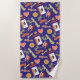 This colourful beach towel with images of the state of California will brighten up any beach or swimming pool. Images include a trolley car, a Oscar statue image, an orange sun, the outline of the state, a red sports car, a pink heart, text that says California and Golden State, the state flag with the traditional bear image, and palm trees! Predominant colours are orange, lime green, and gold, all placed on a dark blue background. Be sure to see the matching products in our store. *Clip art used in this design is copyrighted by Encore Software, Inc., which permits use to its licensors. All rights reserved.