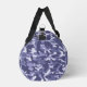 This bag features a delightful camo style pattern in tones of blue, grey blue, and off white. Your triple letter monogram is in white within a matching blue circle banner at the centre.