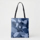 Carry a stylish tote bag with this personalized camouflage patterned design. This trendy camo pattern includes colours in navy, pale blue and medium blue. Customize with your monogrammed initial in a pale blue stencil typography on navy. The perfect gift for family and friends that love camouflage. Designed by artist ©Susan Coffey.