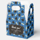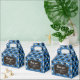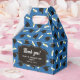Graduation favor boxes printed with a blue pattern of graduation caps and diplomas with a yellow ribbon. Customize the graduation themed favor boxes with the name of the graduate or the name of the celebration, and with the date.