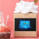 A fractalized blue cat face with stunning yellow eyes against a black background.