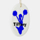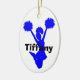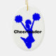Blue silhouette of a jumping cheerleader against a white oval ceramic ornament. Black bold custom text reads Cheerleader, on the back, and name, on the front. Personalize all the text for your special spirit leader. Makes a great gift idea.