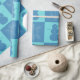 A trendy chequerboard pattern in shades of blue features a simple snowflake and a snowman. Perfect for wrapping those winter holiday gifts.