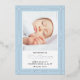 Silver and blue adopted baby boy announcement, introducing your adopted baby boy with chosen, loved, wanted, adopted in silver text surrounding a photo of your baby. His name in a silver script.