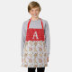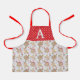 This adorable apron features a blue pinstriped background with gingerbread, chocolate cookies, star sugar cookies, and peppermint candies. Top has a red and white polka dot pattern. Personalize with an initial.